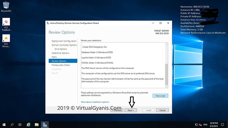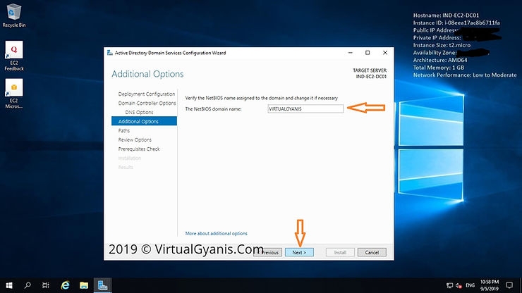 Additional Optionstab, enter aNetBIOSname for your domain. It is suggested to keep the NetBIOS name the same as the root domain name (by default, it will fetch the domain name only). Then, click Next to continue.