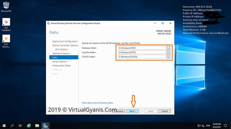 In the Path tab, you have to mention the Database (NTDS Database), LOG files and SYSVOL folders path. You can change the default path as per your organization security policies. I have kept them default. Now, click Next to continue.