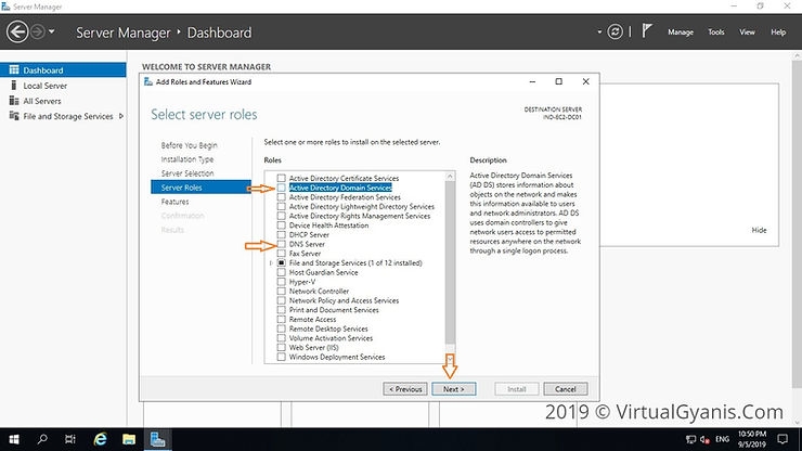 In the Server Roles tab, put a tickmark for "Active Directory Domain Services" (you can select the DNS Server role as well, as we will configure AD integrated DNS server. If not selected, during installation it will automatically select and install the DNS Role).