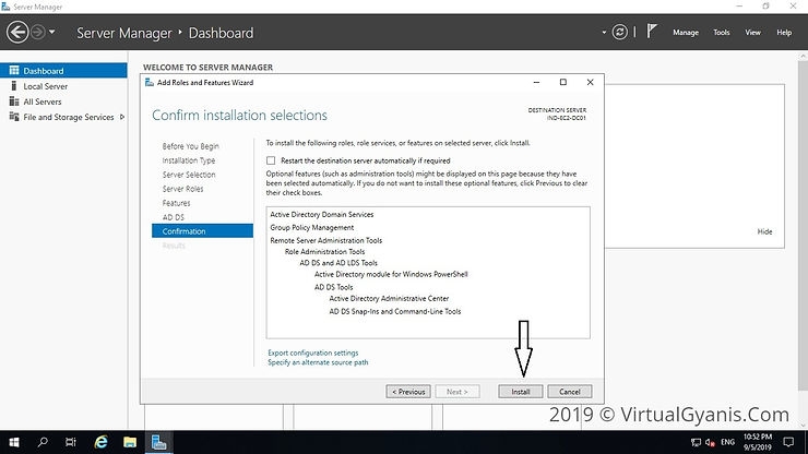 In the Confirmation tab, verify the selections and click on the Install button. You may or may not select the option "Restart the destination server automatically if required". It is always a best practice to restart the server post-installation.