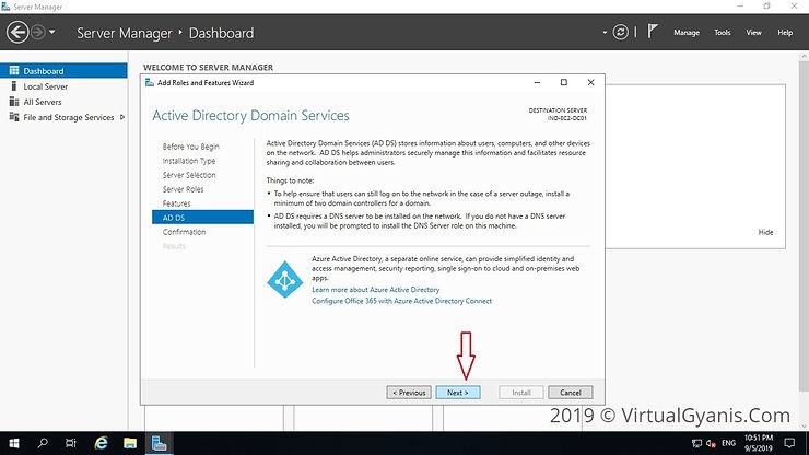 In the next window, it gives brief information about the "Active Directory Domain Services" service. Click next to proceed.