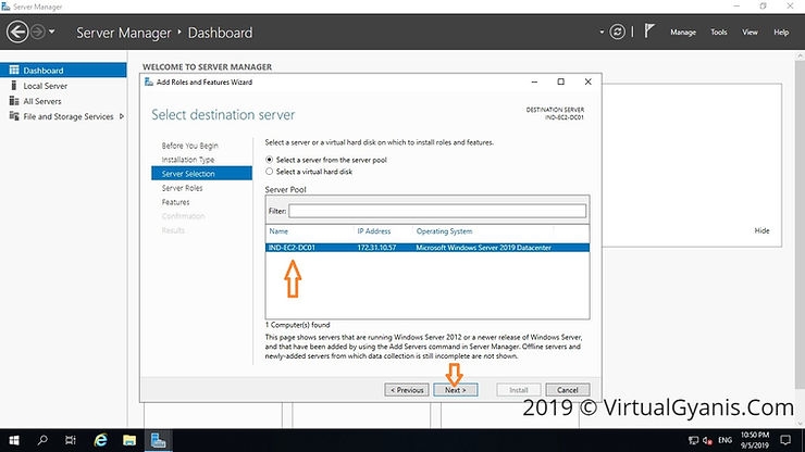 In the Server Selection tab, please select the destination server on which the role will be installed. Please verify the hostname and the IP address points of the selected server. Click Next to continue.