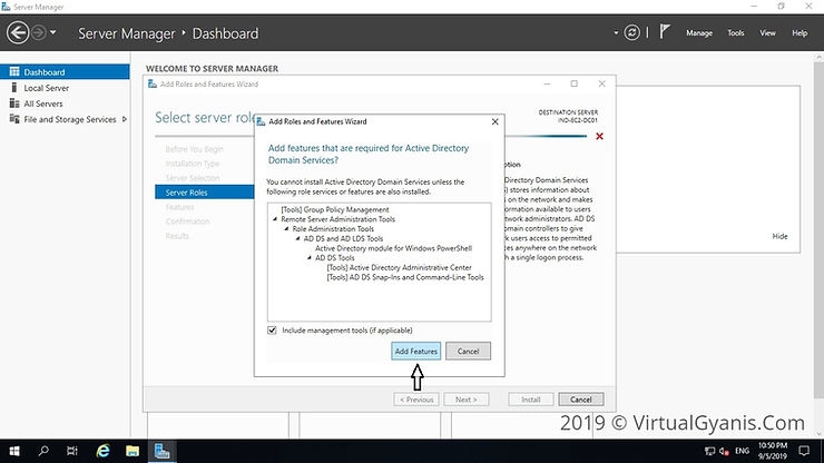 Then, it will prompt to show you the associated features for the role. Click on Add Features to add those. Then click Next to continue.