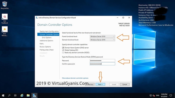 Domain Controller Optiontab, select aForest functional leveland aDomain functional levelas per your environment. Since this is the first domain controller in the forest, please select theDNS Server (as we are configuring AD integrated DNS)and theGlobal Catalog (GC)checkboxes. Then, enter theActive Directory Restore Mode (DSRM)password, this is used to retrieve/restore Active Directory data. Then, clickNextto continue