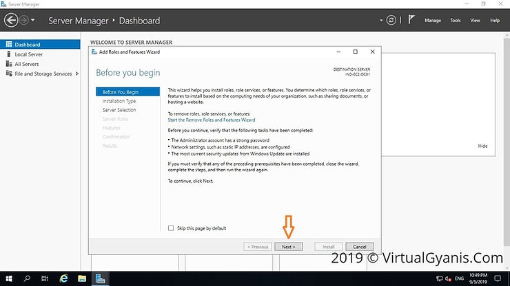 Log into your Windows Server 2019 with administrative credentials. Open Server Manager → click on Dashboard → click on Add roles and features.