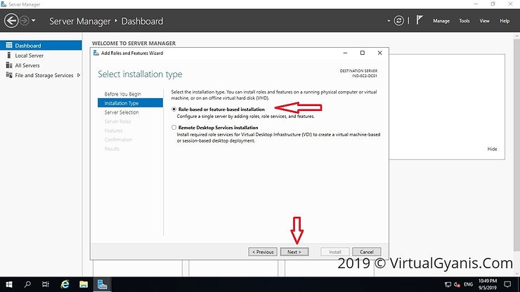 In the "Installation Type" tab choose Role-based or Feature-based installation and click on the Next button.