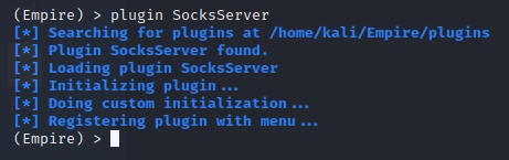 To use a plugin, transfer a plugin.py file to the /plugins directory of Empire. As an example of how to use plugins, we will be using the socks server plugin made by BC-Security, you can download it here.