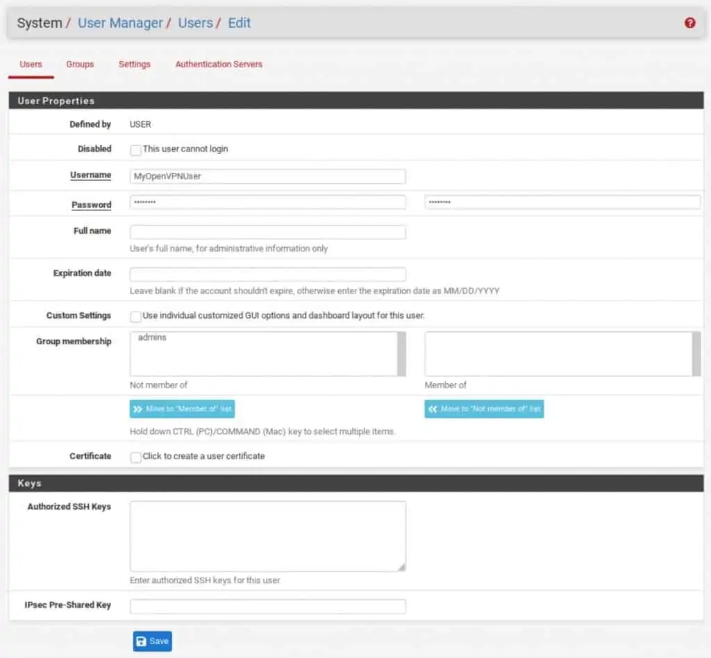 Click Save. You’ve created your OpenVPN user and are taken back to the User Manager.