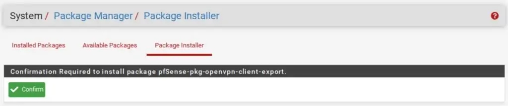 Scroll down until you see openvpn-client-export and click the Install button to its right. You’re taken to the Package Installer page.