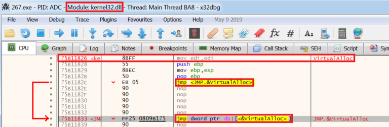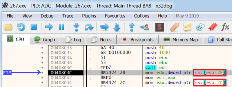 EIPto point toVirtualAllocBy checking the parameters that are being passed after the space in memory has been allocated we can see if the unpacked malware is being stored in these parameters which are highlighted below.