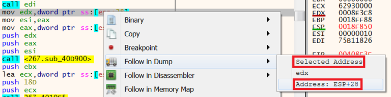 Right-clicking on [esp+28]and then selectingFollow in Dumpwill display the contents of this parameter. Using the optionSelected AddressorAddress: ESP+28will provide the same outcome.