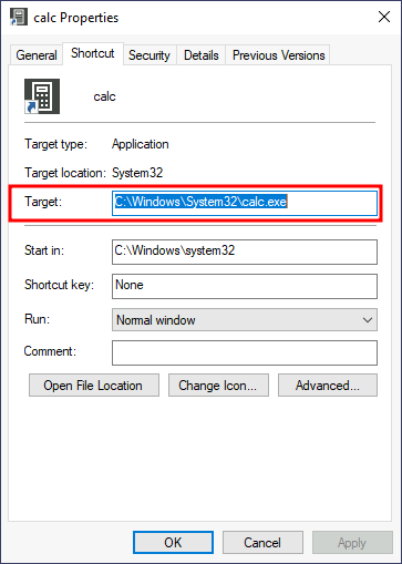 C:\Windows\System32or any other sneaky location. The script will execute a reverse shell and then run calc.exe from the original location on the shortcut's properties: