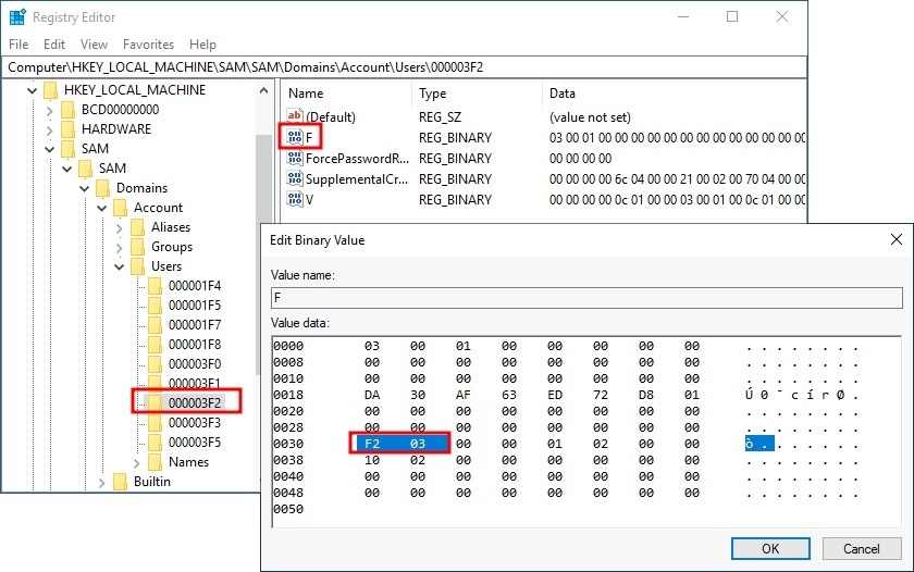 RIDin hex(1010 = 0x3F2). Under the corresponding key, there will be a value calledF, which holds the user's effectiveRIDat position0x30: