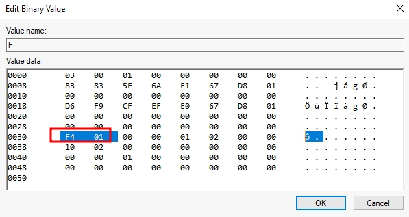 We will now replace those two bytes with the RID of Administrator in hex (500 = 0x01F4), switching around the bytes (F401):